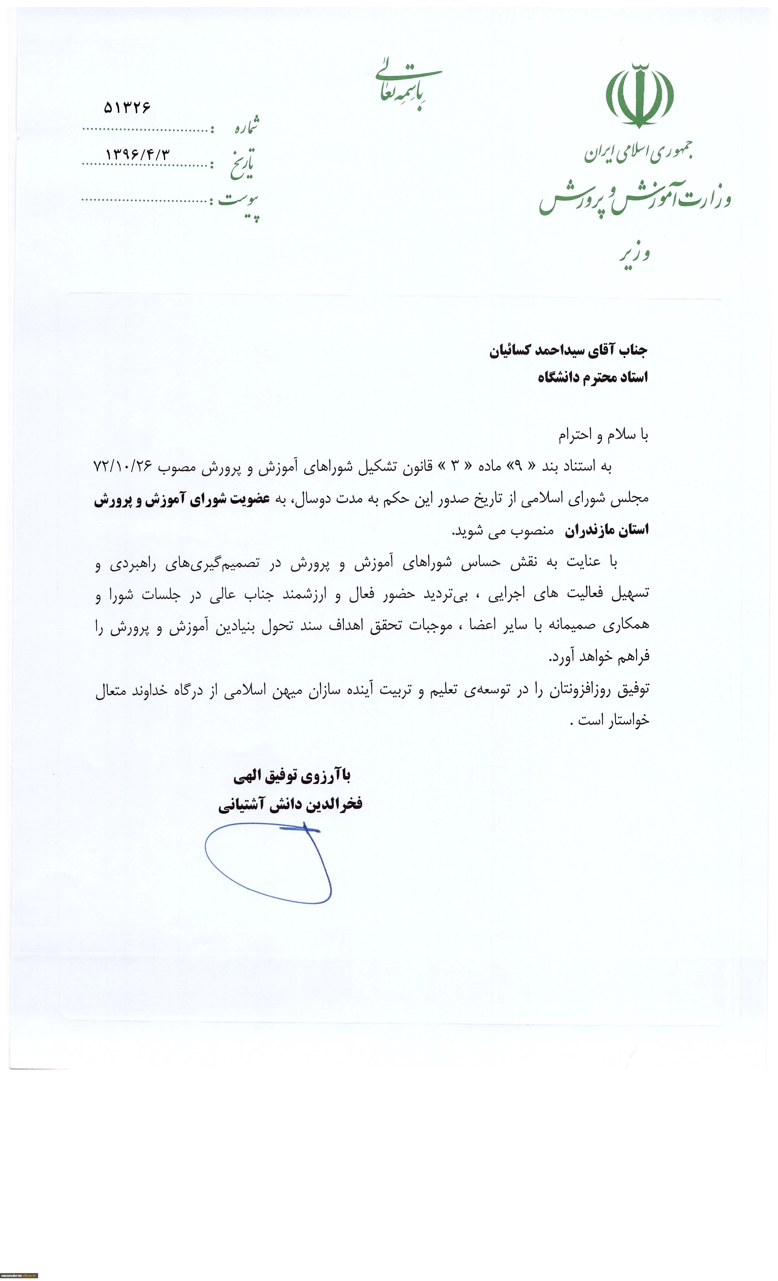 طی حکمی ازسوی دکتردانش آشتیانی وزیرمحترم آموزش وپرورش دکتر سید احمد کسائیان به عنوان عضو شورای آموزش وپرورش استان مازندران منصوب شد. 2