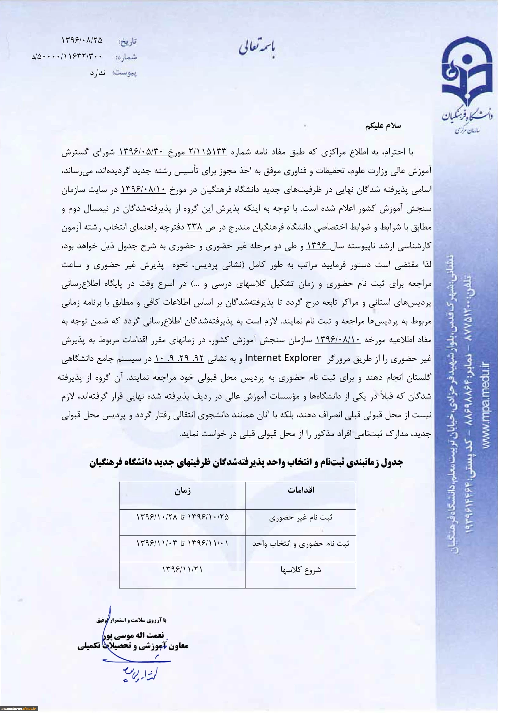 جدول زمانبندی ثبت نام و انتخاب واحد پذیرفته شدگان ظرفیتهای جدید دانشگاه فرهنگیان در مقطع کارشناسی ارشد 2