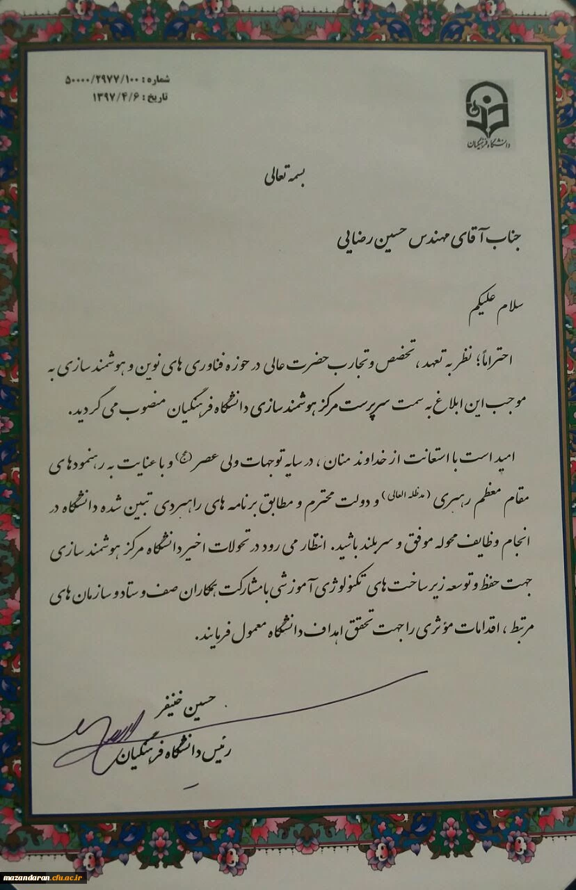 با حکمی از سوی دکتر خنیفر، مهندس رضایی به عنوان سرپرست مرکز هوشمند سازی دانشگاه منصوب شد.