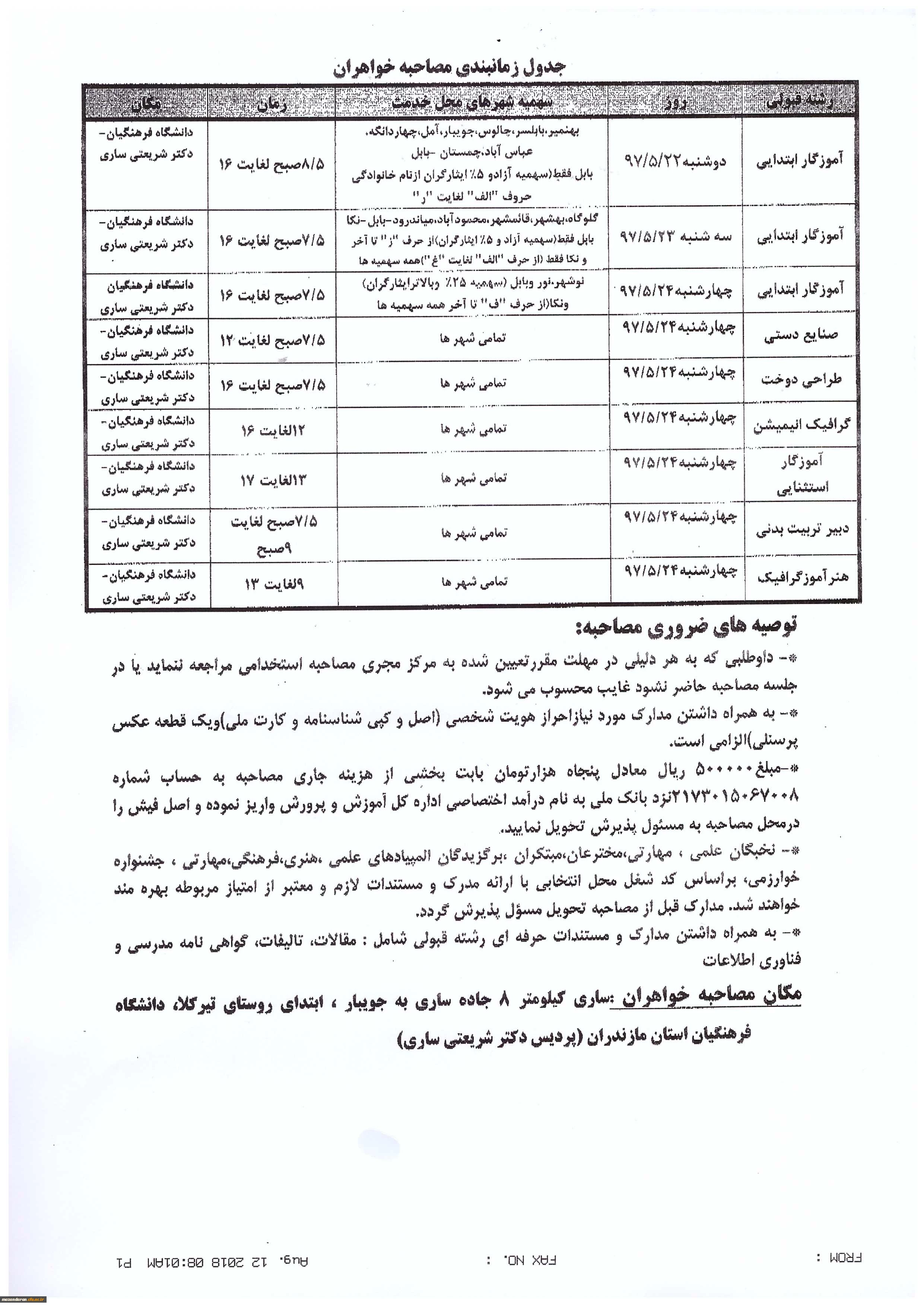 در پردیس دکتر شریعتی ساری برگزار می گردد: اجرای مصاحبه پذیرفته شدگان آزمون استخدام پیمانی آموزش و پرورش ورودی سال 1397