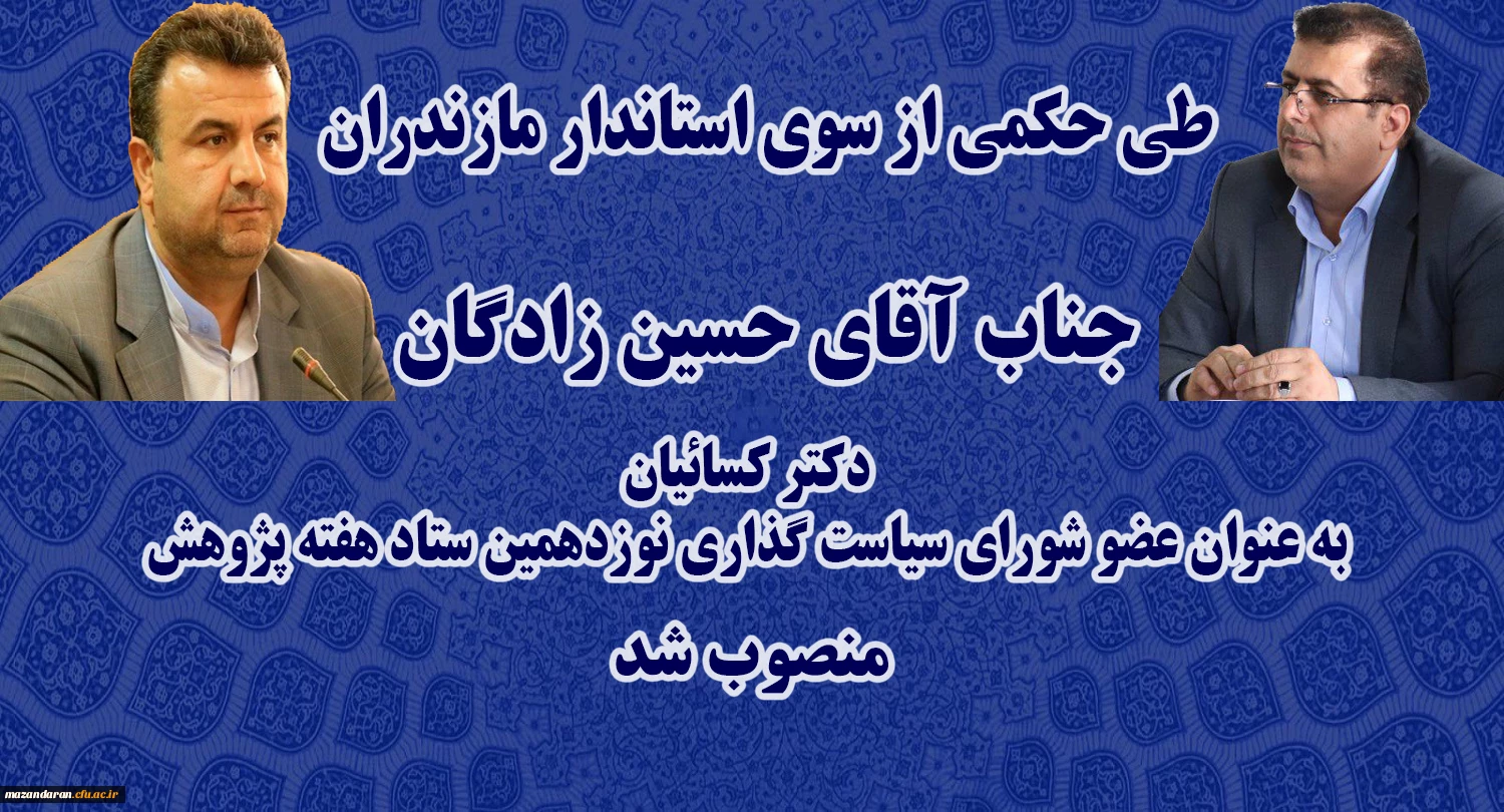 طی حکمی از سوی استاندار مازندران: دکتر کسائیان بعنوان عضو شورای سیاستگذاری نوزدهمین ستاد هفته پژوهش استان مازندران منصوب شد