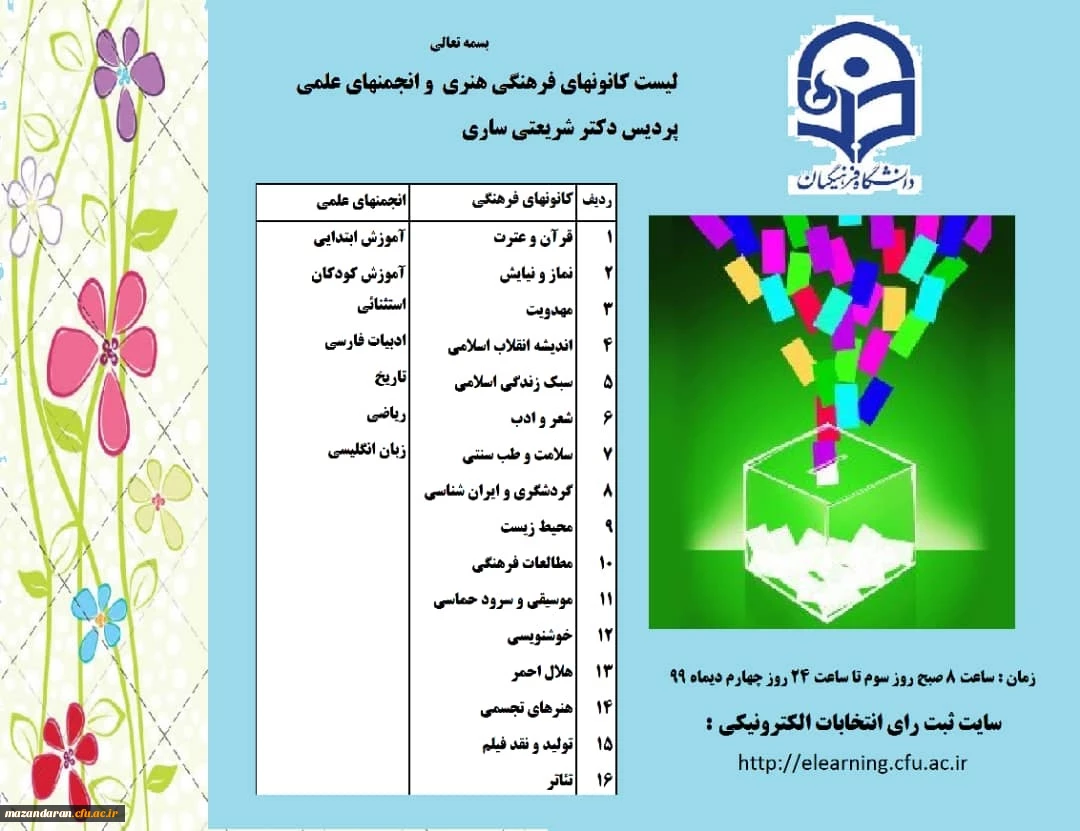 امتیاز دهید : برگزاری انتخابات کانون و انجمن های علمی دانشگاه فرهنگیان استان مازندران 5 پنجشنبه 4 دی 1399 ساعت 21:48