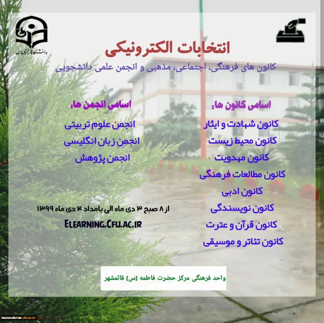 امتیاز دهید : برگزاری انتخابات کانون و انجمن های علمی دانشگاه فرهنگیان استان مازندران 8 پنجشنبه 4 دی 1399 ساعت 21:48