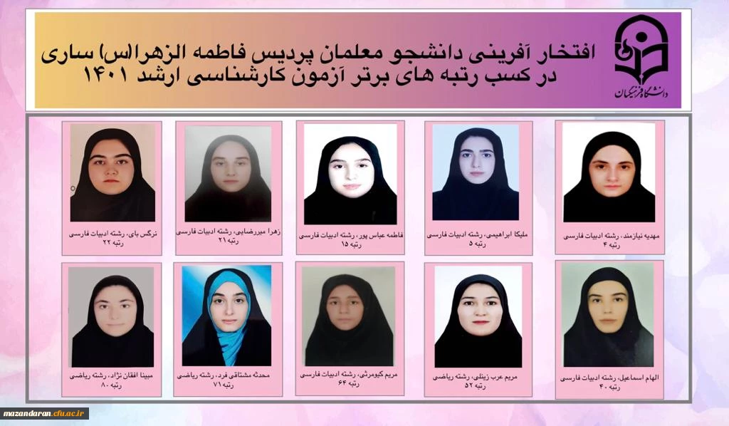 افتخار آفرینی دانشجو معلمان پردیس فاطمه الزهرا(س) ساری در کسب رتبه های برتر آزمون کارشناسی ارشد 1401 2