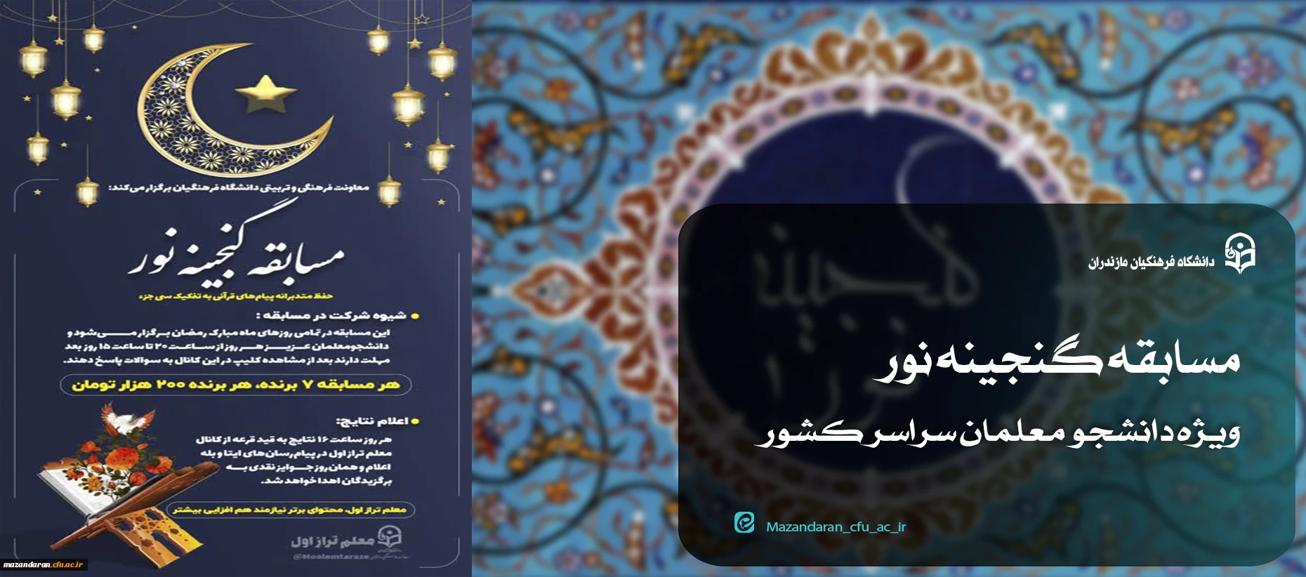 امتیاز دهید : مسابقه گنجینه نور ویژه دانشجو معلمان سراسر کشور برگزار می شود 3 سهشنبه 22 اسفند 1402 ساعت 12:02