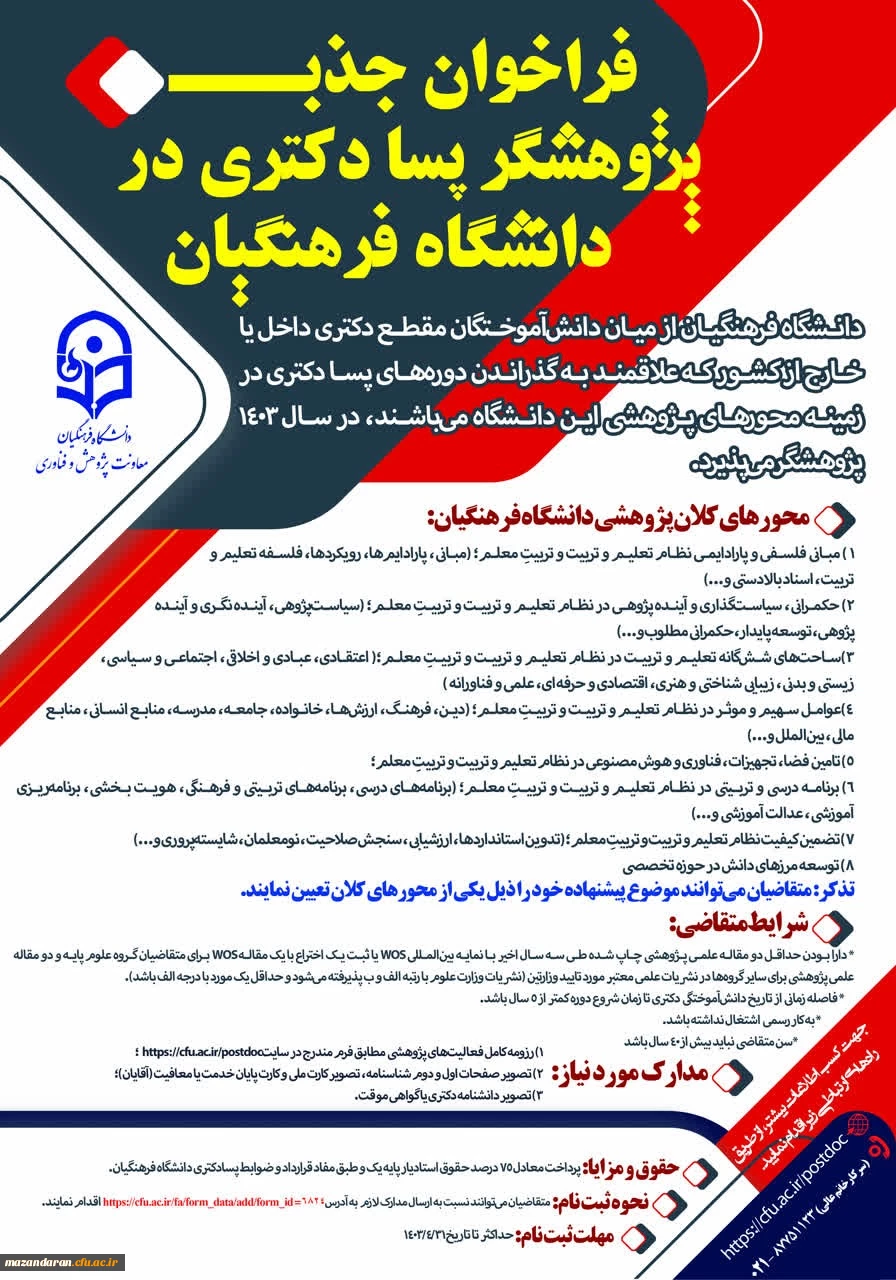 فراخوان جذب پژوهشگر پسادکتری در دانشگاه فرهنگیان 2