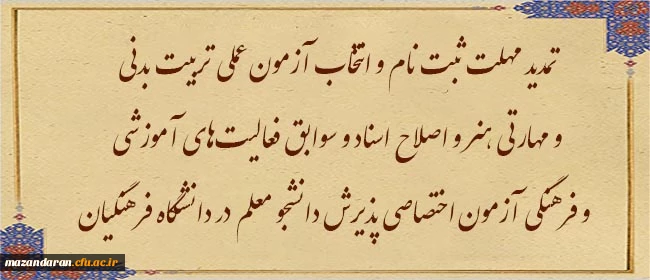 تمدید مهلت ثبت نام و انتخاب آزمون عملی تربیت بدنی و مهارتی هنر و اصلاح اسناد و سوابق فعالیت های آموزشی و فرهنگی آزمون اختصاصی پذیرش دانشجو معلم در دانشگاه فرهنگیان سال ۱۴۰۳ 2